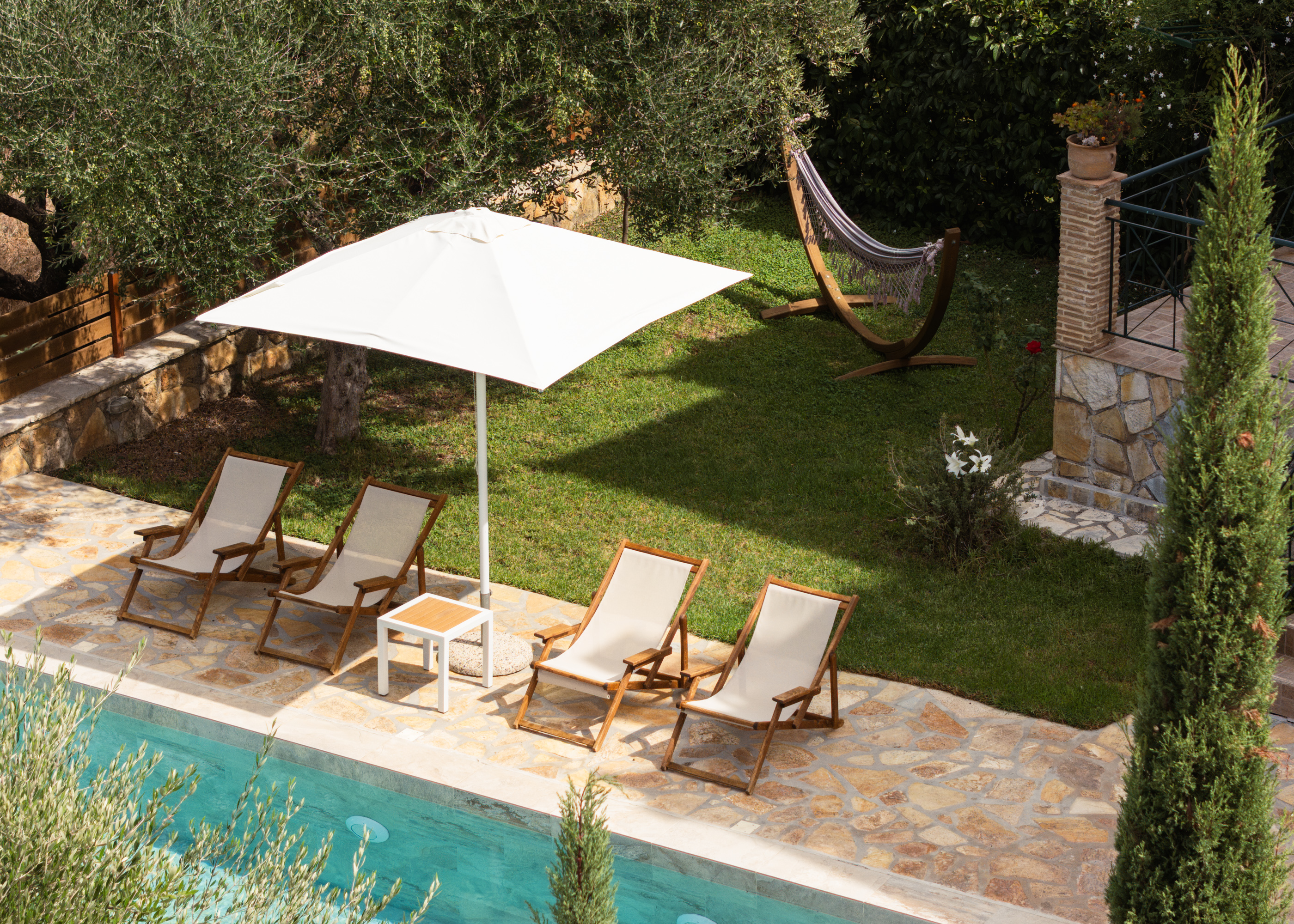 BOOK NOWThe external spaces of each one of our villas are surrounded by a natural idyllic landscape that awakens the senses and makes a luxurious home away from home. A gorgeous private pool as well as the stone-built table and wall , along with a garden mostly lawn and several flowers, compose enchanting scenery.